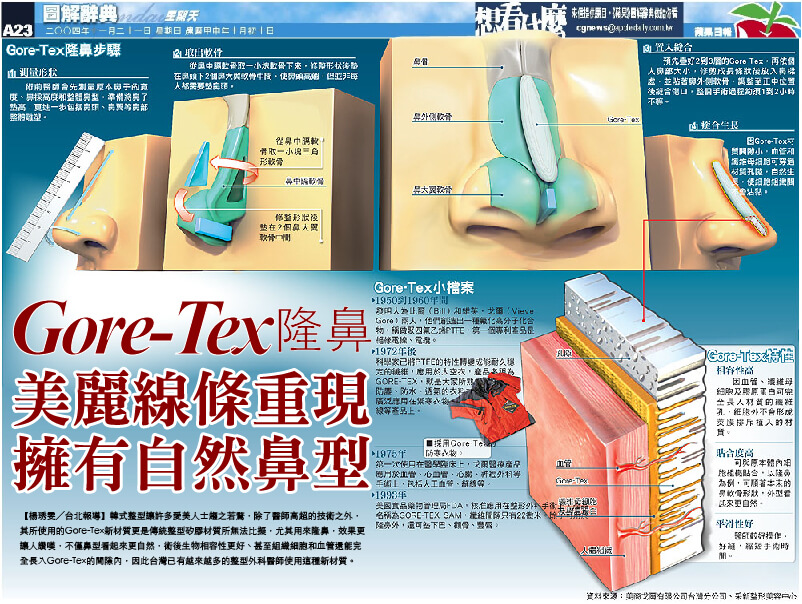 Goretex是一種高分子聚合物,不容易被一般酸鹼融化、耐高溫可消毒、與人體接觸不會釋放危險化學物質,它的表層有許多的空隙,植入人體不僅無害且相容性高,並容易讓組織附著生長,應用在醫療上的成效良好,所以1993年美國FDA核准Goretex用於整形美容,也因GoreteX有諸多優點取代以往常見矽膠,同時也運用於下巴、顴骨、凹陷眼眶或顏面骨折。