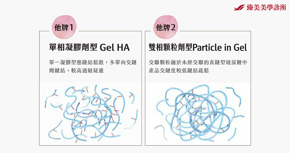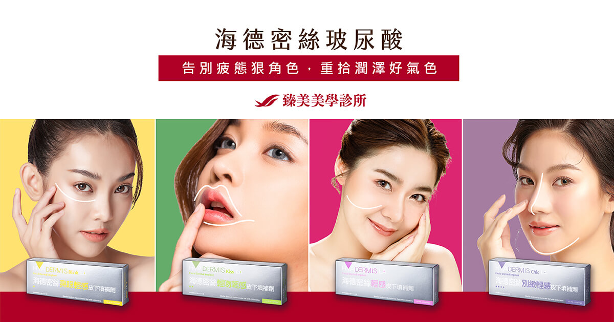 有別於它牌以單一母膠過篩製成不同粒徑產品的方式,海德密絲分別由四權不黏彈性母牌製成,真正依據各部位所需特性創造出四種劑型:凝膠型Bink輕盈柔軟;軟顆拉Kiss最易上手;晶體顆粒Smile中臉中線皆宜;高黏彈性Chic輪廓雕塑最有型。Hya-Dermis海德密絲有四種不同的分子結構劑型,在支撐度及適用部位上也有所不同,因此臻美美學診所醫師可替患者量身打造最適合的療程。