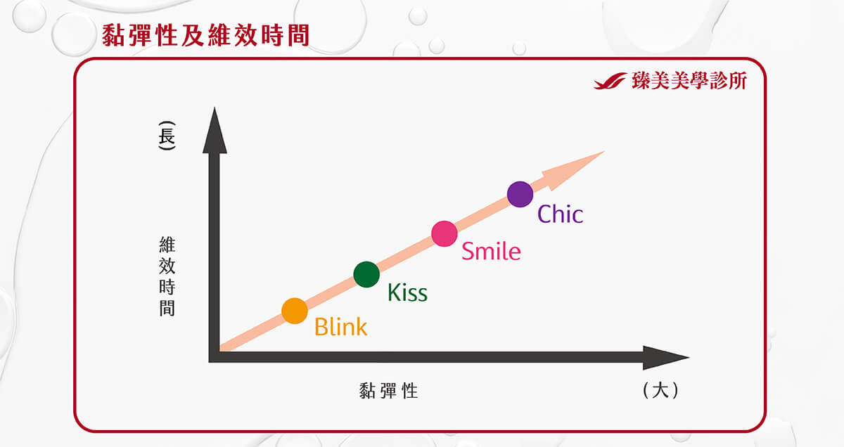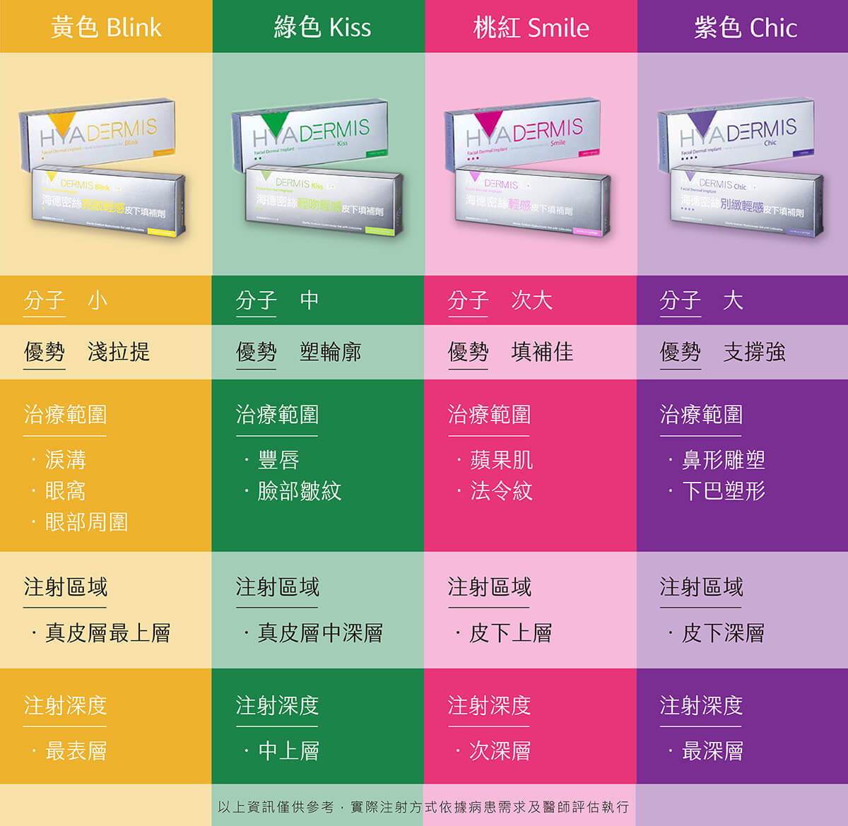 分子次小(偏乳膠狀的質地),「Kiss海德密絲」多半使用於豐唇、臉部較深層皺紋、輪廓的修飾、和較小範圍的蘋果肌等部位。