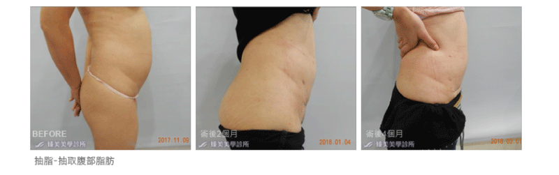 腹部的特色在於腹部環抽,從正面腹部、腰內肉到背部的脂肪,做360度的環狀抽取,深層抽脂將脂肪搗碎抽出,淺層可運用音波將脂肪乳化抽取,會依據患者腹部肌肉線條來打薄肌肉上層的脂肪,藤術後呈現緊實馬甲線條。