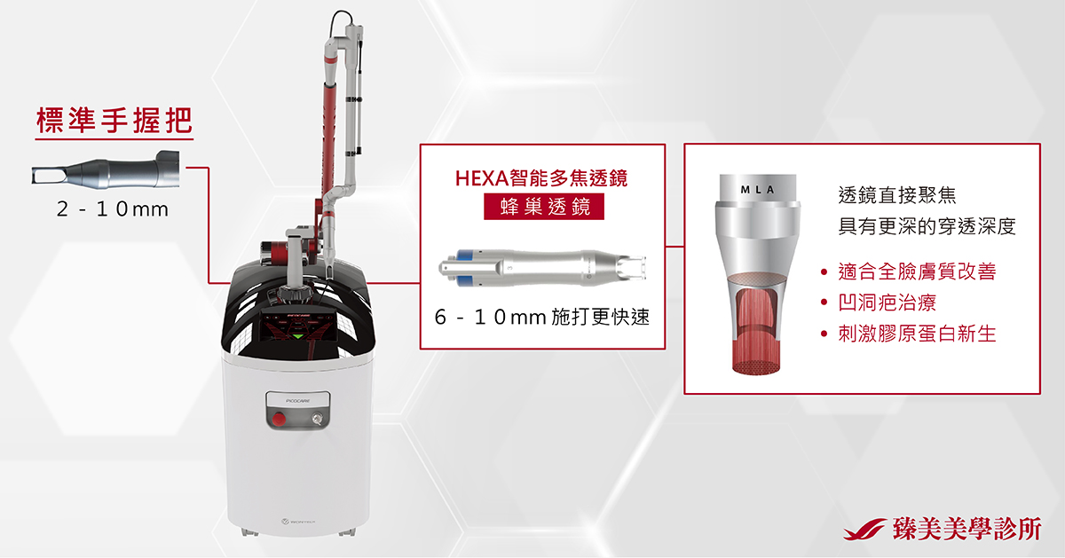Picocare皮秒雷射加裝HEXA智能多焦透鏡(俗稱蜂巢透鏡),能將雷射光能量集中放大,在不破壞表皮的情況下,在皮膚真皮層震盪出許多小空泡,產生空泡效應(LIOB, laser-induced optical breakdown),能刺激膠原蛋白新生。